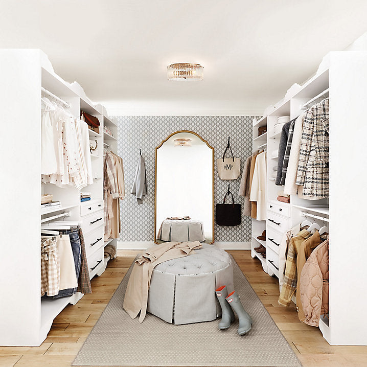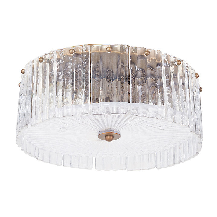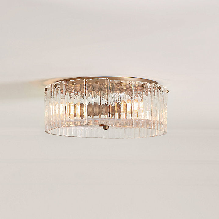 A shimmering silhouette in lustrous rippled glass. Our Brinkley Glass Ceiling Mount has three lights softened with curving panes of wavy glass, each cast by hand for an artisan-made look. This round ceiling fixture adds elegant sparkle and an inviting glow in the entry hall, powder room or master bedroom closet.