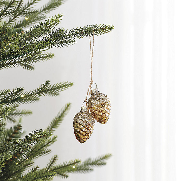 If you're feeling a bit rustic this year, but still yearn for a little glam, our Glass Pinecone Ornament hits every designer note perfectly. Two classic pinecone shapes are made of glass with glittering gold finish and hang together on one jute twine string.