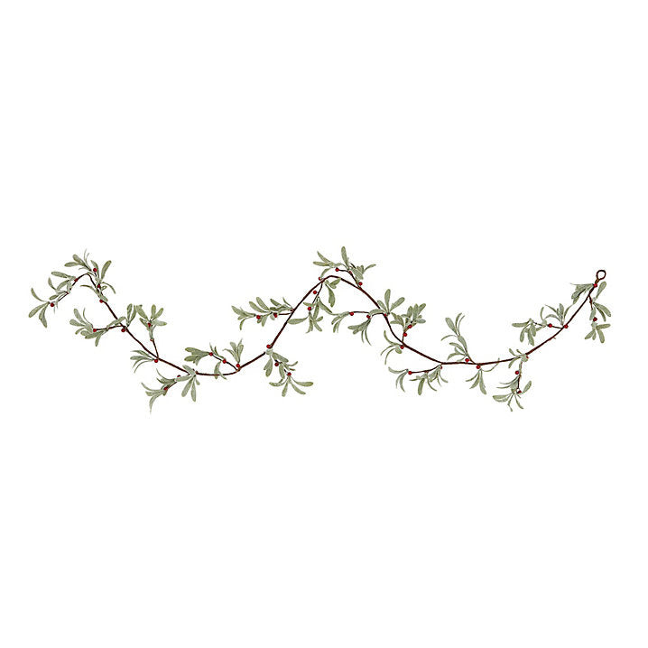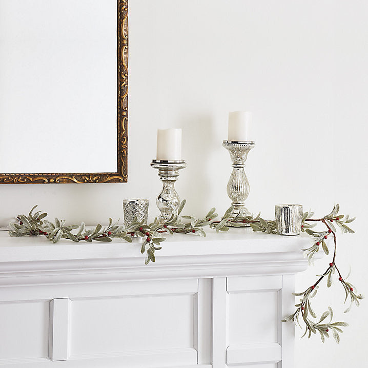 Weave our Holly Berry Leaf Garland through your chandelier, drape it over a mantel, or run it down the center of your dining room table for festive color and texture. Almost six feet long, the slender bendable stem is filled with frosted green leaves and bright red berries for a wintry look.