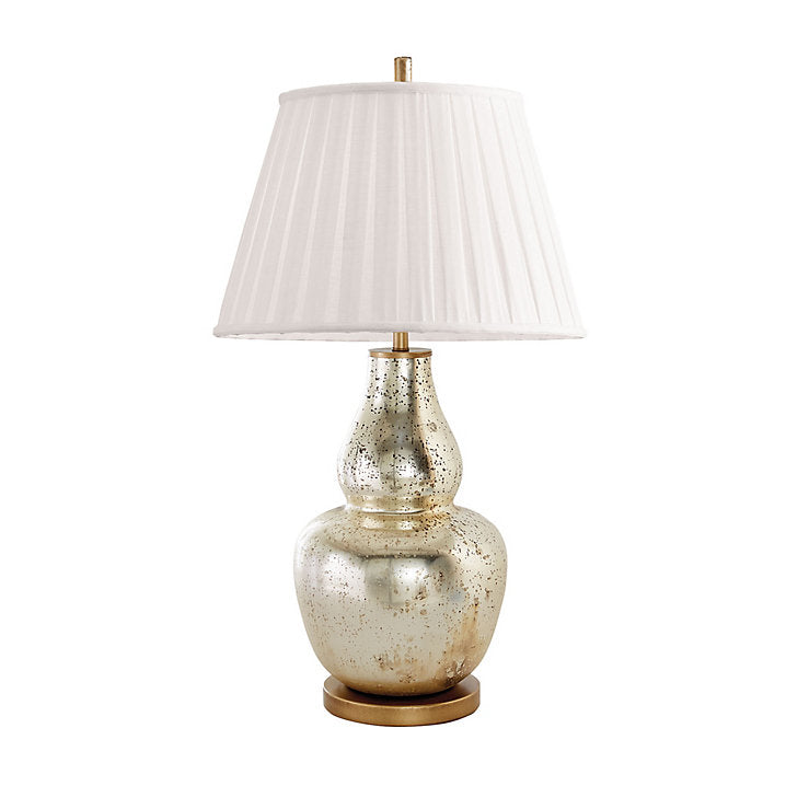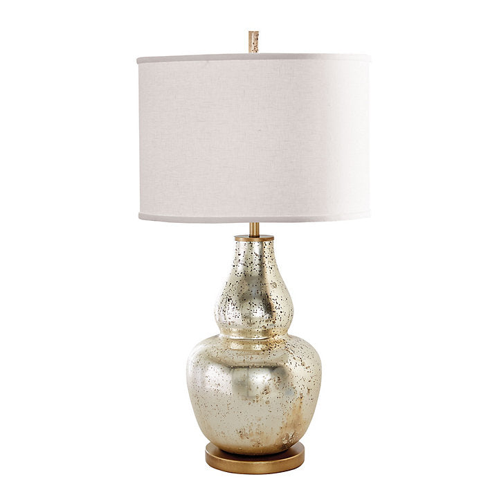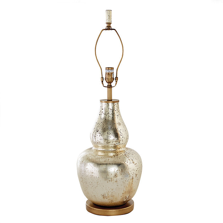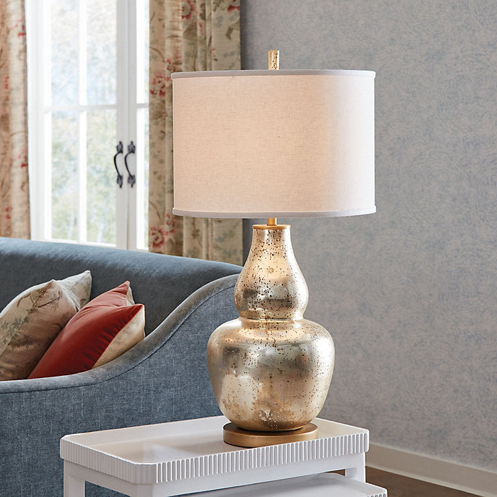 Our Loretta Table Lamp is a shimmering silhouette in graceful curves. The shapely double-gourd shape is handmade of glass and expertly hand finished to capture the silvery champagne patina of antique mercury glass. A matching cylindrical finial takes the elegant look over the top. Because this special accent lamp is made by hand, expect artful variations in the glass's tone and shading. Give the lamp base a custom designer look with your favorite shade from our endless online collection.