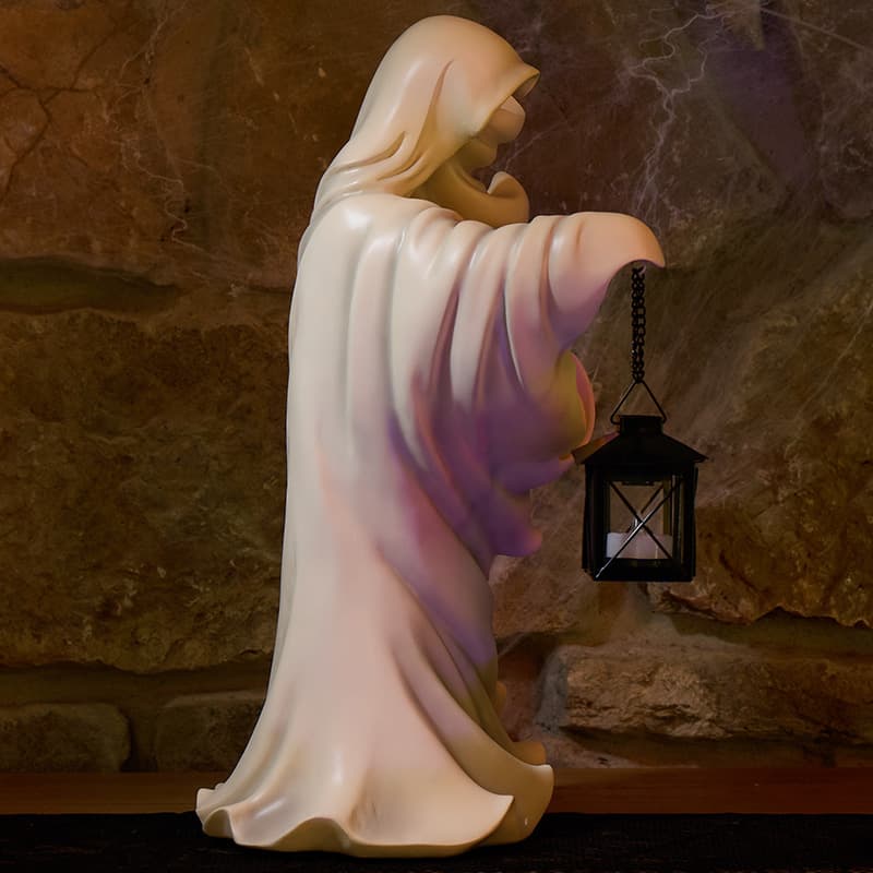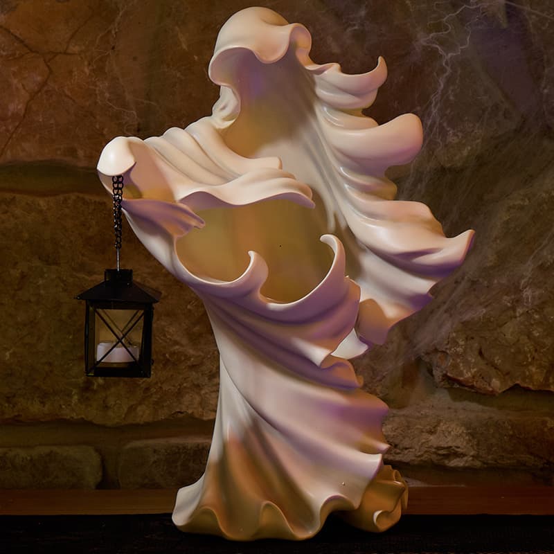 This spooky spirit is ready to haunt your home with a mysterious presence, a little light adds a small glow inside the lantern guiding the ghost.