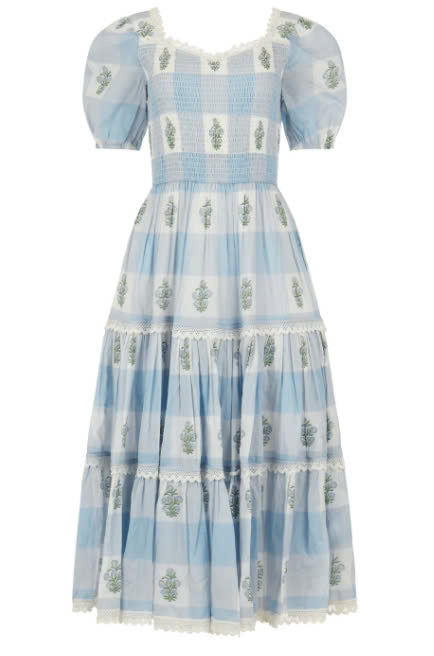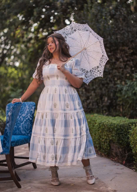 The Felicia Dress is the epitome of timeless charm with its soft blue gingham pattern and delicate floral embroidery. Featuring a smocked bodice, puff sleeves, and tiered skirt, it offers a comfortable yet flattering fit. Finished with lace trim accents, this dress brings a touch of vintage-inspired elegance to everyday wear. Perfect for garden strolls, brunches, or countryside escapes.