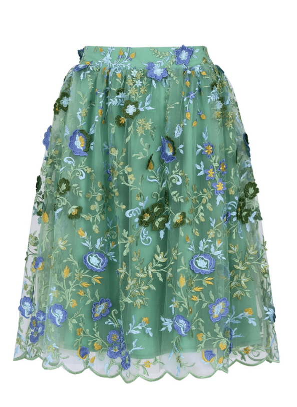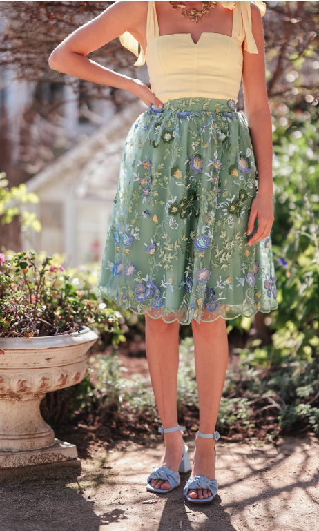 Adorned with intricate blue, yellow, and green floral appliqués, this skirt is perfect for elevating your spring/summer wardrobe and making a statement at any occasion. Perfectly paired with your favorite top.