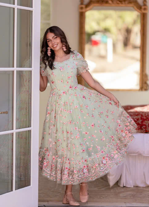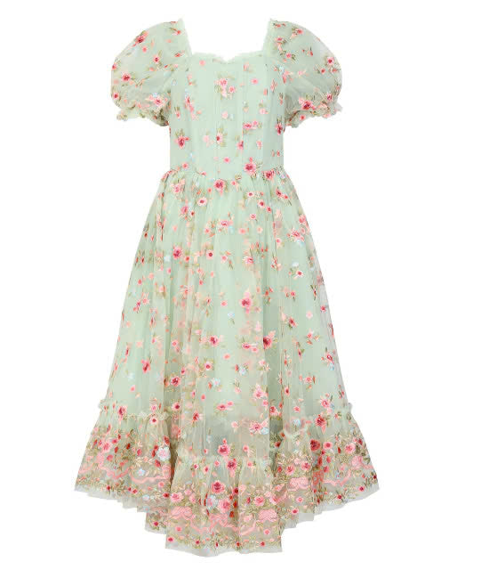 The Rosalie Dress is a fairytale come to life, featuring delicate floral embroidery over a soft sage-green tulle. With its romantic puff sleeves, fitted bodice, and flowing tiered skirt, this dress is designed for dreamy elegance. Intricate bow embroidery along the hem adds an extra touch of whimsy, making it perfect for garden parties, special occasions, or twirling under the stars. Embrace your inner romantic with this enchanting, vintage-inspired masterpiece.