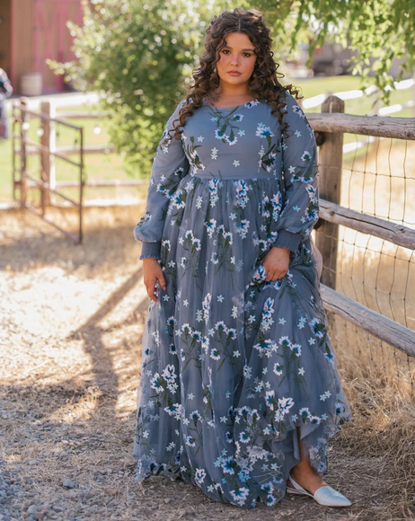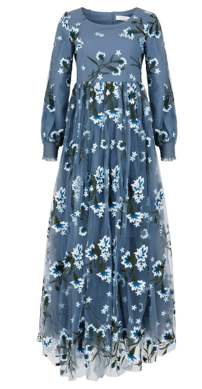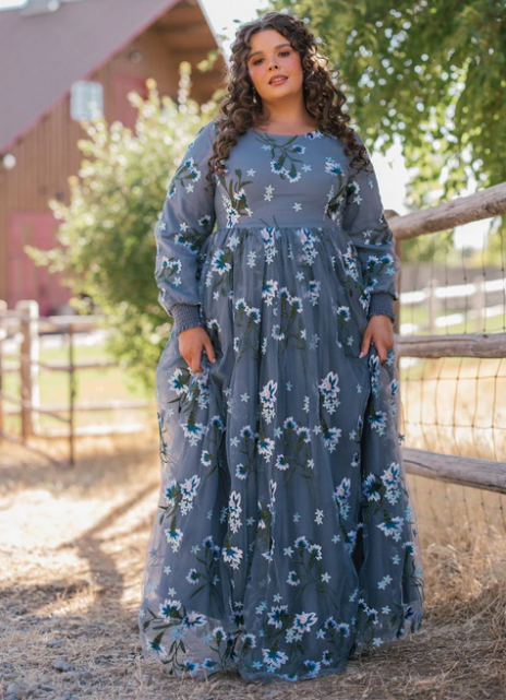 The Rowan Dress is a breathtaking blend of sophistication and natural beauty. Featuring a serene, dusky blue hue adorned with intricate white and green floral embroidery, this dress evokes the tranquility of a woodland meadow. The flowing silhouette and long, puffed sleeves offer modesty and elegance that is perfect for both formal occasions and enchanting everyday wear!