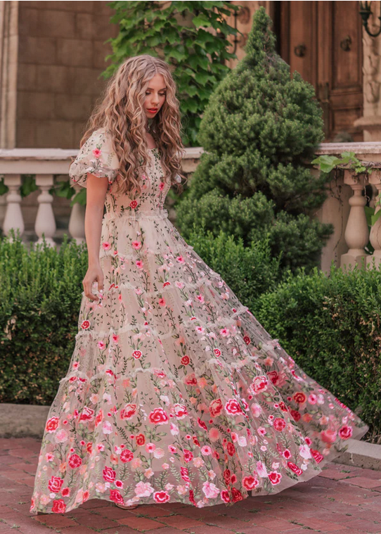The Rose Dress is a stunning piece that will transport you to a world of whimsy and romance. Pink/yellow roses and elegant ruffles cascade down the skirt, adding a touch of femininity and movement to every step.