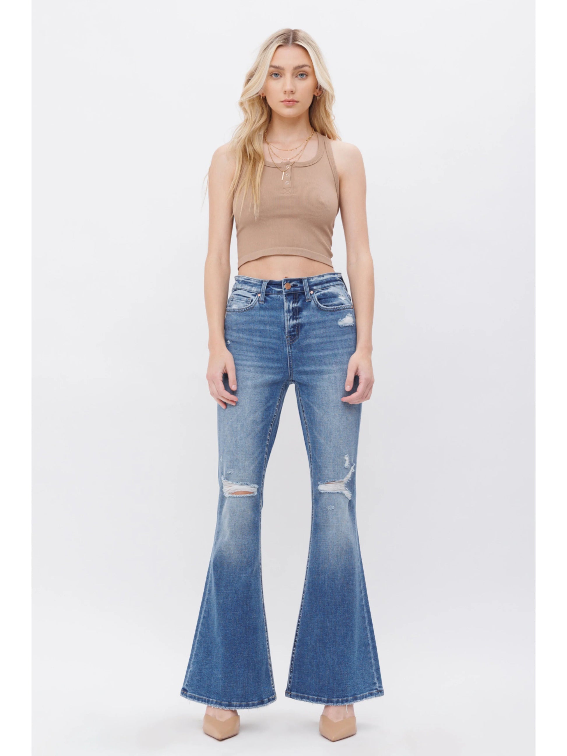 These High Rise Flare jeans are designed for maximum comfort and style. With a flattering high rise fit and flared leg, they elongate your silhouette for a flattering look. Upgrade your wardrobe with these must-have jeans.
