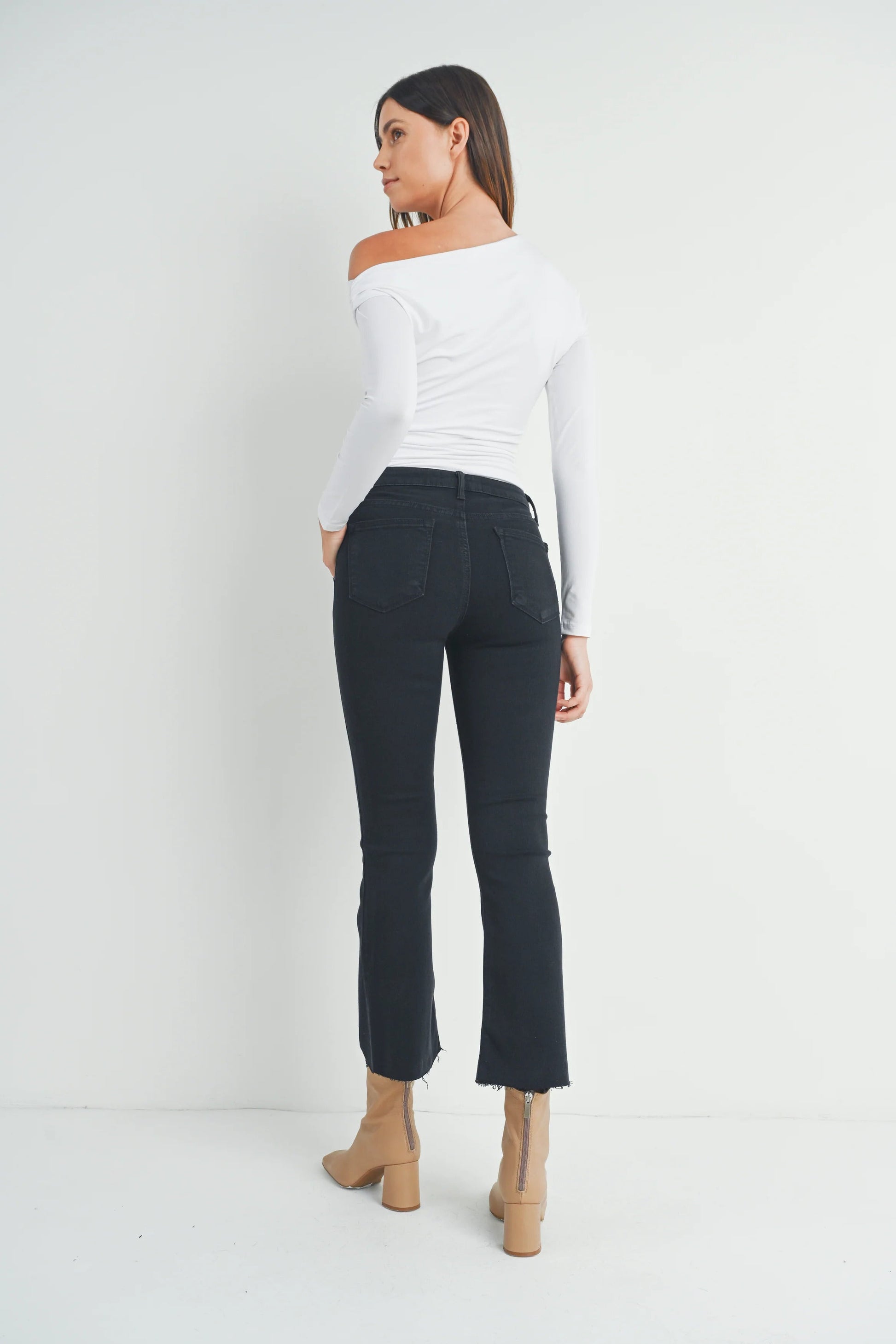 Upgrade your denim game with the Just Black- HR Tonal Crop Flare. These stylish and comfortable jeans feature a high rise waist and cropped flare hem for a flattering fit. Perfect for any occasion, these jeans will become your new go-to for effortless style.