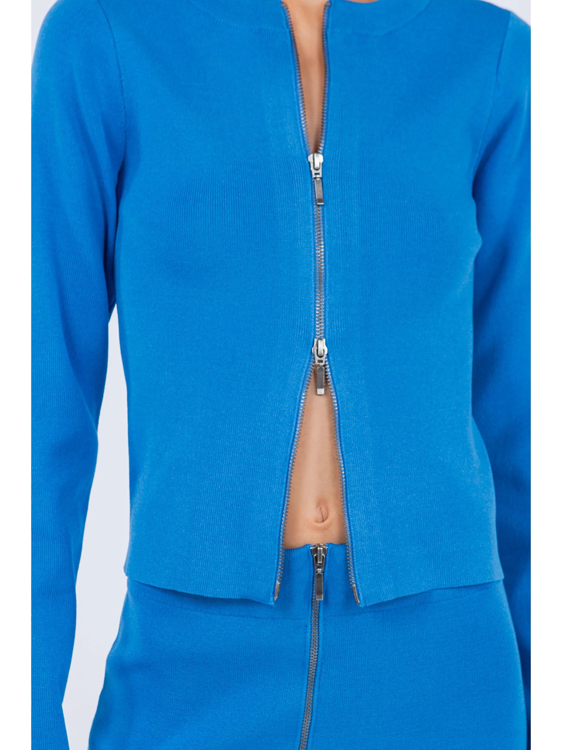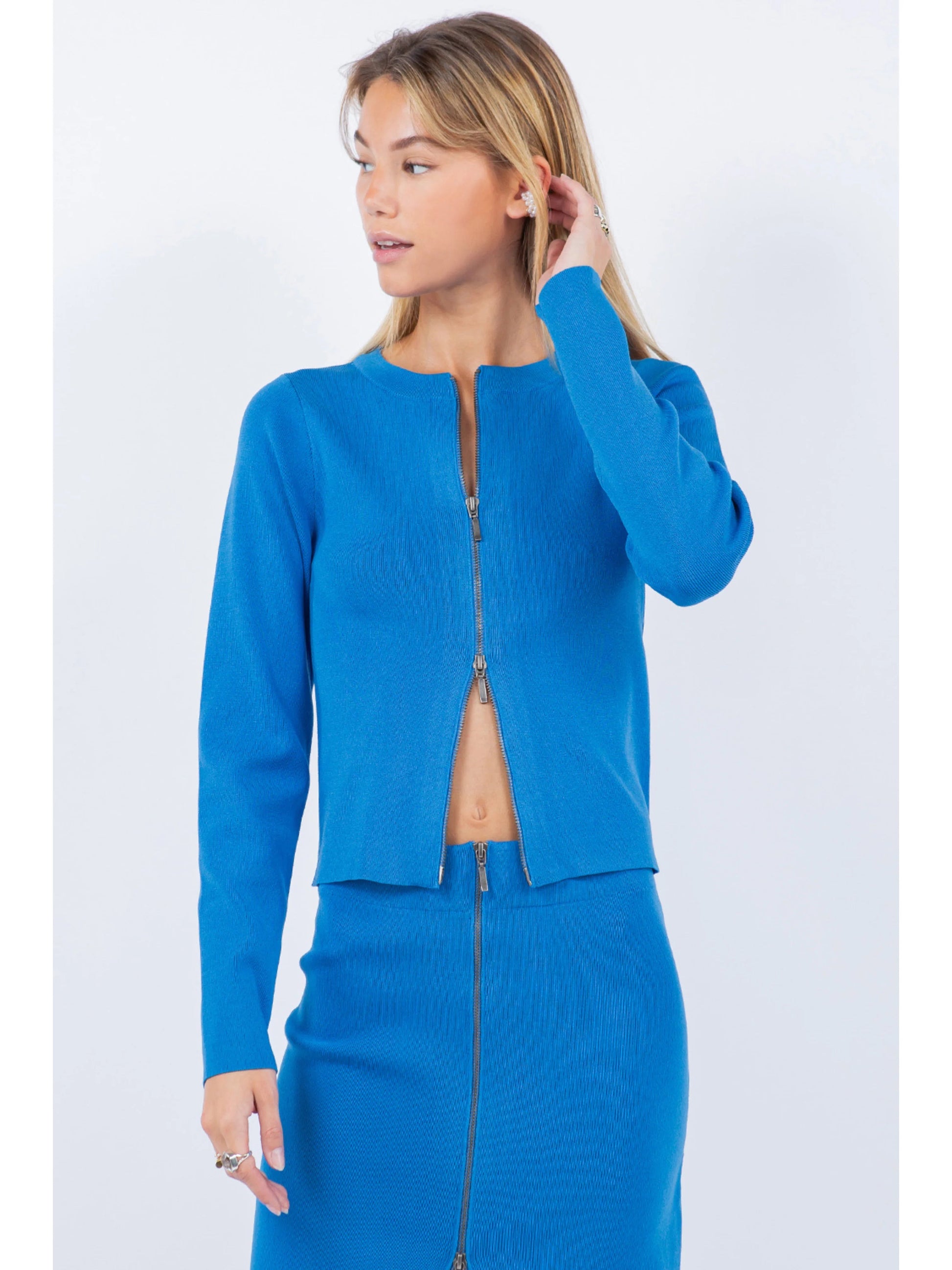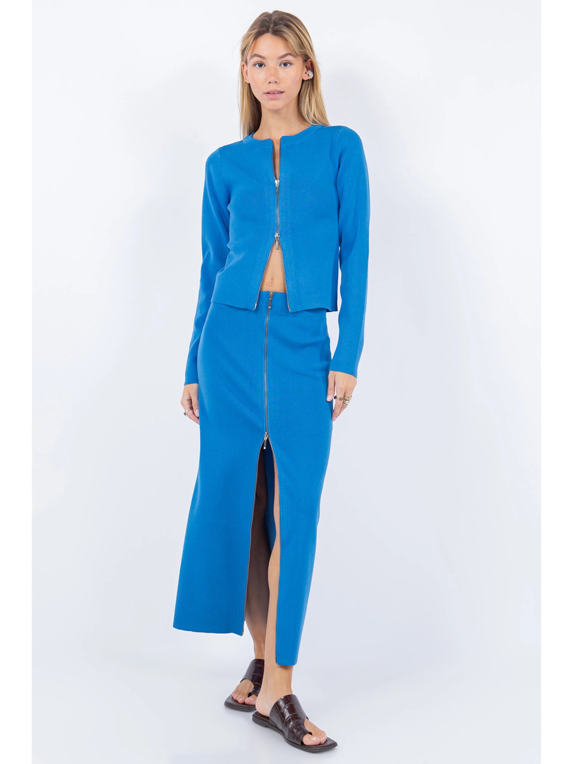 Effortlessly chic and versatile, our Zip Up Detailed Rib Top With Skirt is a must-have addition to your wardrobe. The zip-up detailing adds a modern twist to the classic ribbed design, while the matching skirt creates a seamless and flattering silhouette. Perfect for any occasion, this set offers both style and comfort.