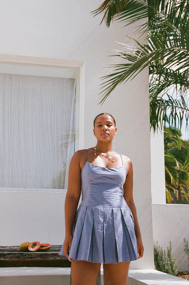 ?A super feminine silhouette designed to flatter, the Angelica Dress is made from a natural linen cotton blend fabric in a blue hue. It features thin rouleau straps, scooped neckline, fitted longline waist and pleated mini skirt. Dress it up for a night out with the Mariana Heels! Designed exclusively by Sabo.