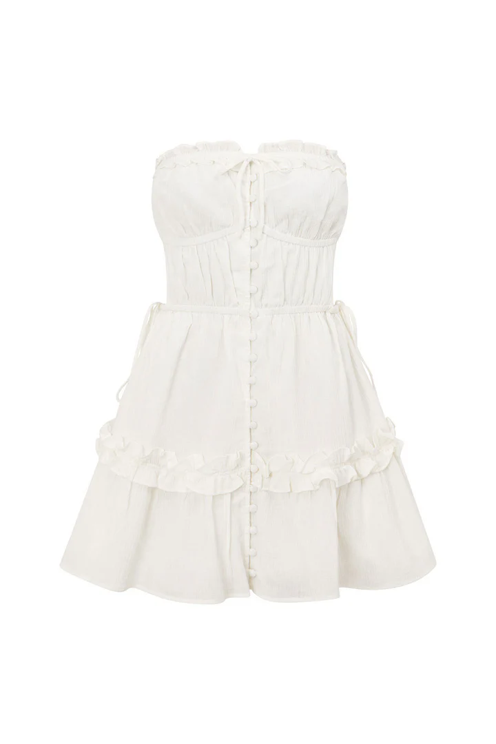 ?A Sabo style LWD! The Backless Aston Dress is made from a natural crinkle cotton fabric in a cream hue. It features an open back with tie details, strapless straight neckline, ruffle panels at neckline and skirt, elasticated panels under bust and at waist, covered buttons down centre front and a flouncy mini skirt. Dress it up with the Strappy Paz Heels for your next night out! Designed exclusively by Sabo.
