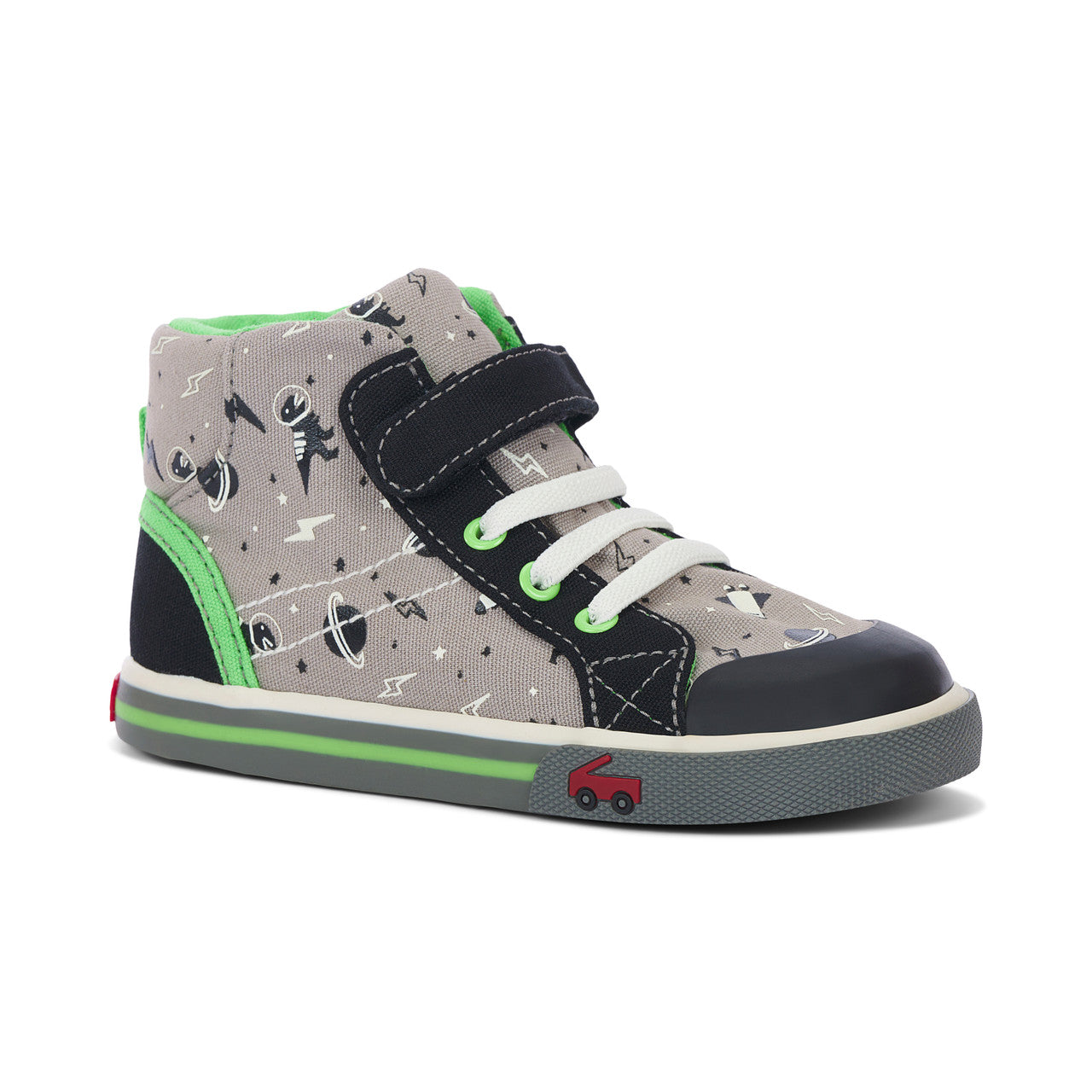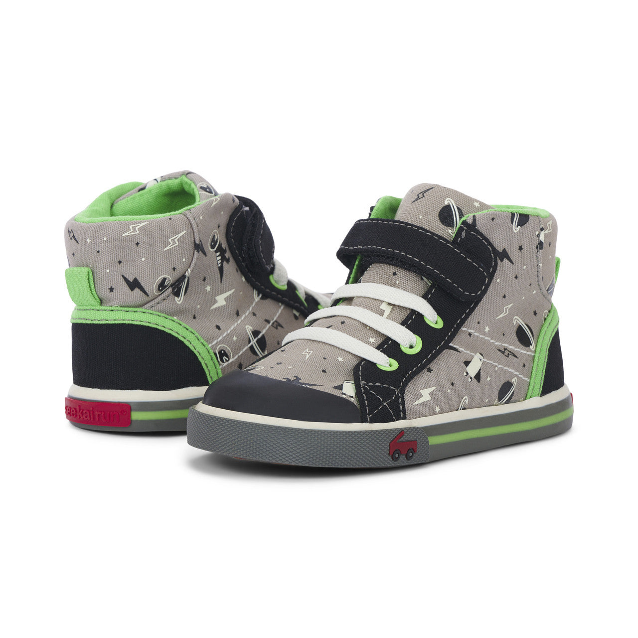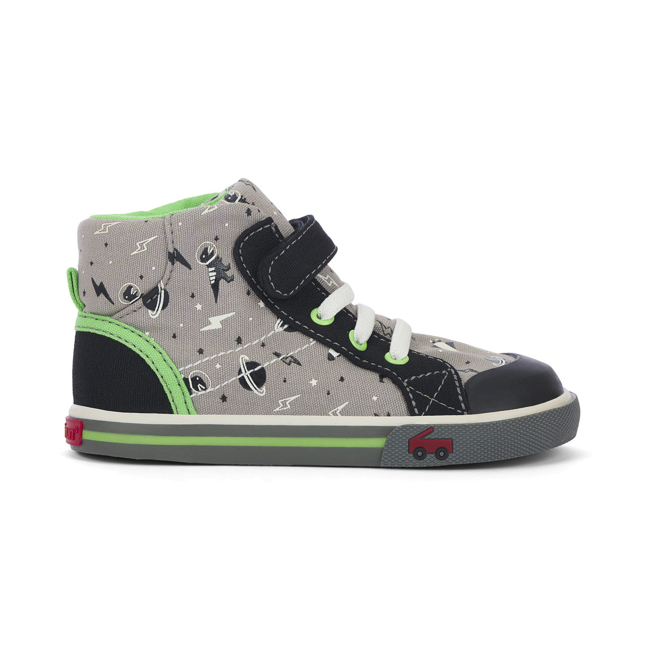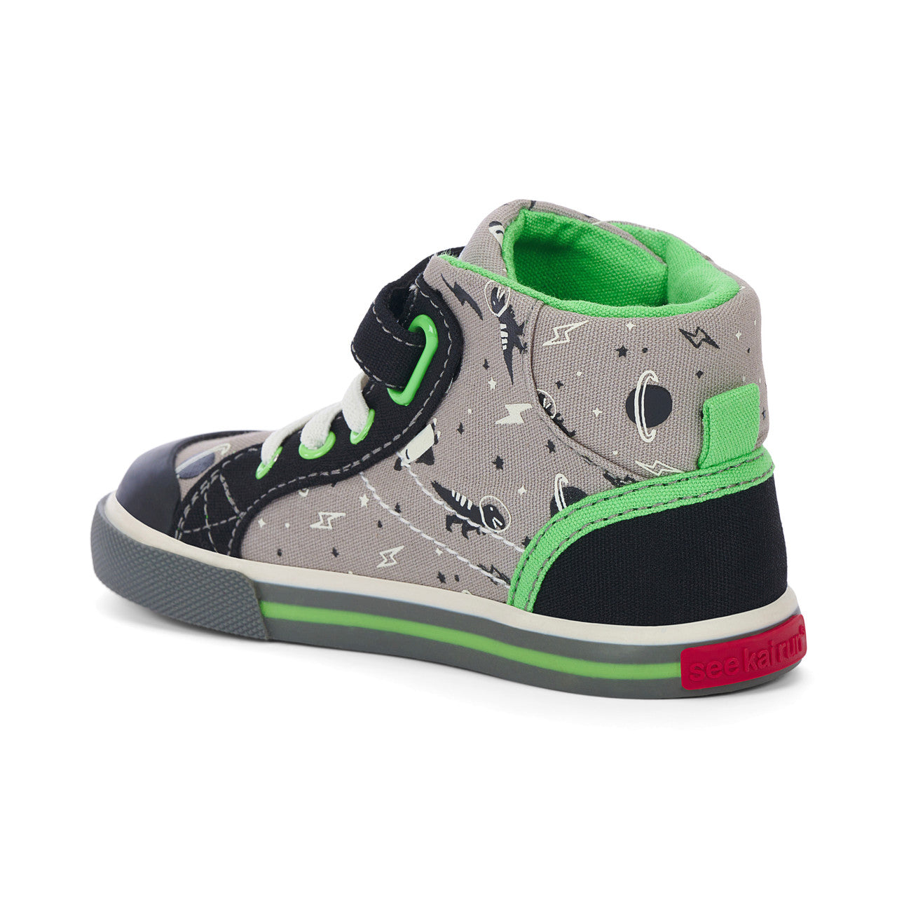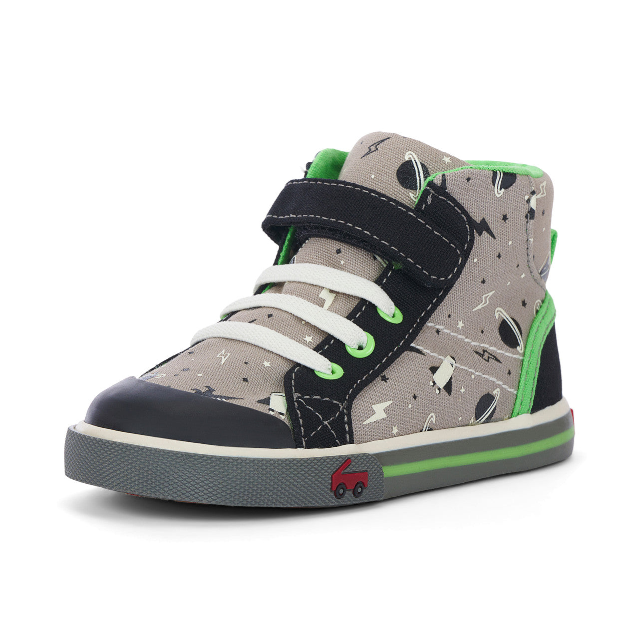 Skyrocket his style to new heights with our glow-in-the-dark Dane high top, available only at seekairun.com. Comfortable and supportive for all-day play and finished with a futuristic space print, he’ll never want to leave home without it.