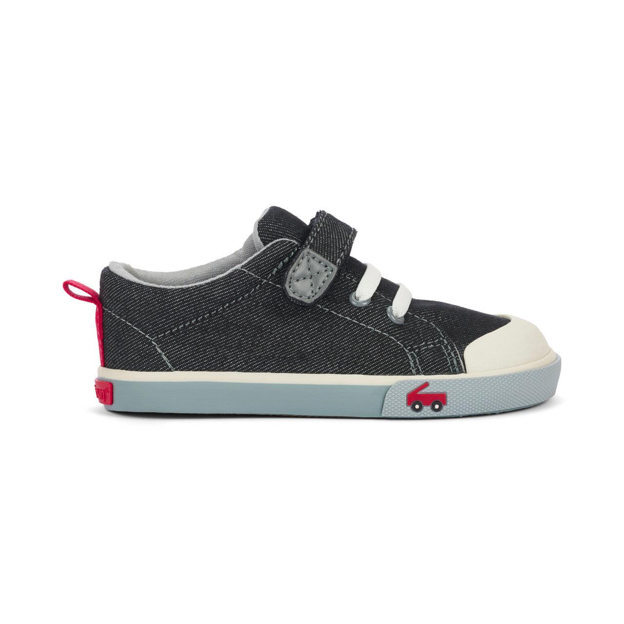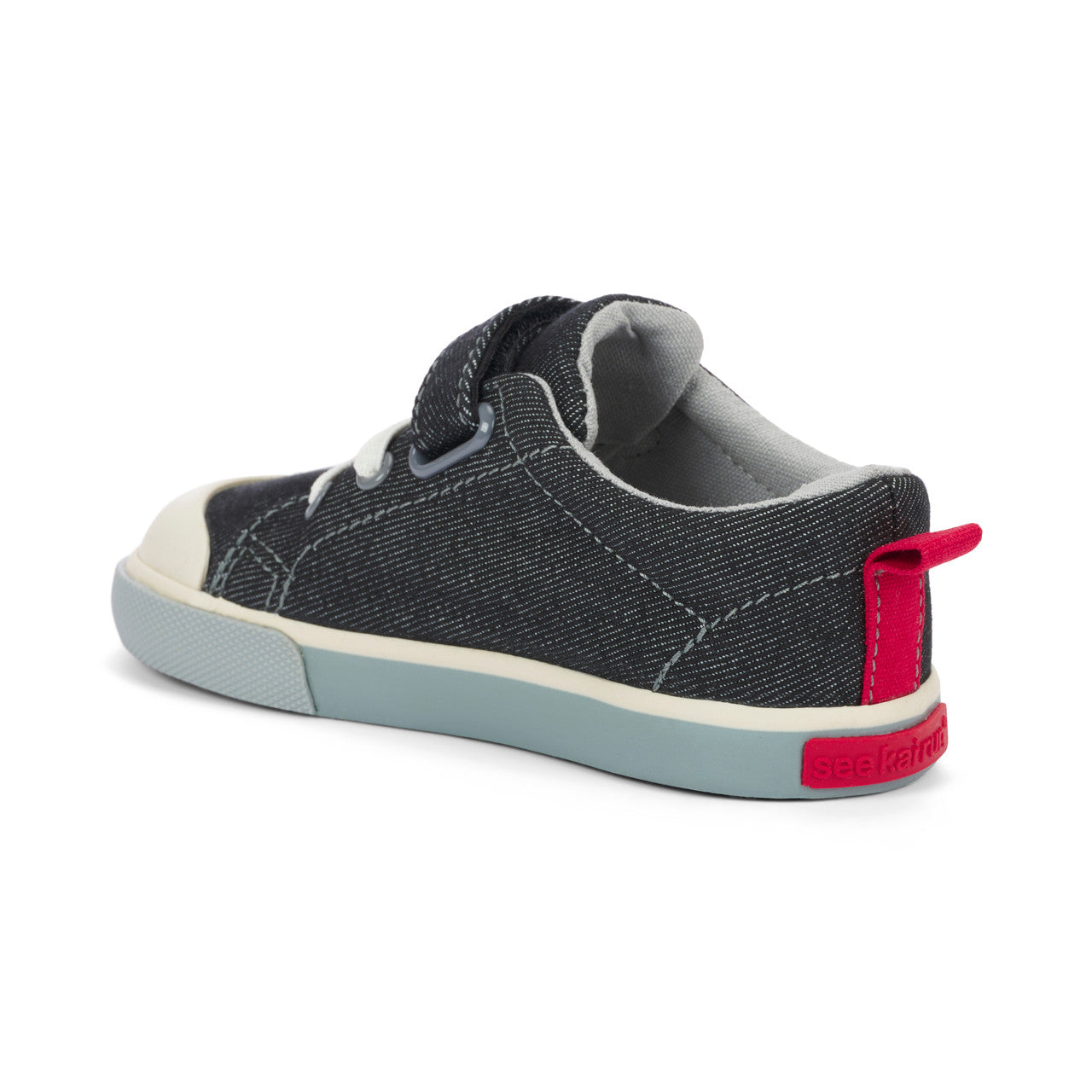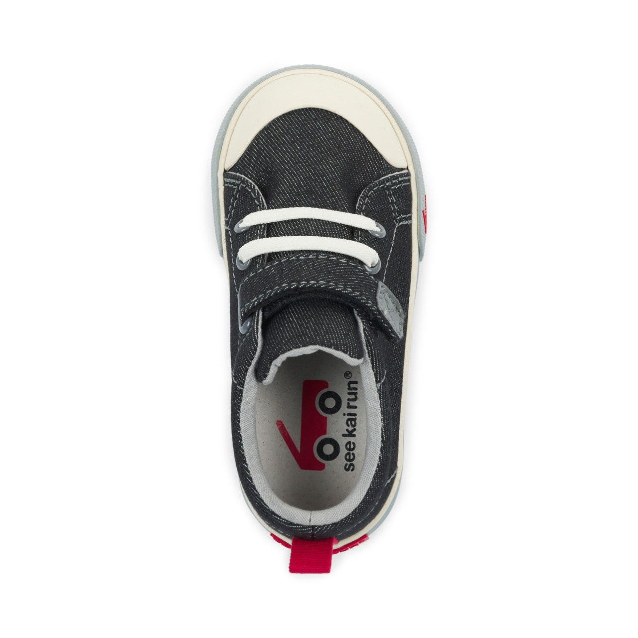 Step up their sneaker game with our classic black denim sneaker with gray accents! Featuring a leather lined removable molded footbed for happy feet, a natural rubber toe cap for superhero-level protection, and lightweight, flexible construction for all-day play.
