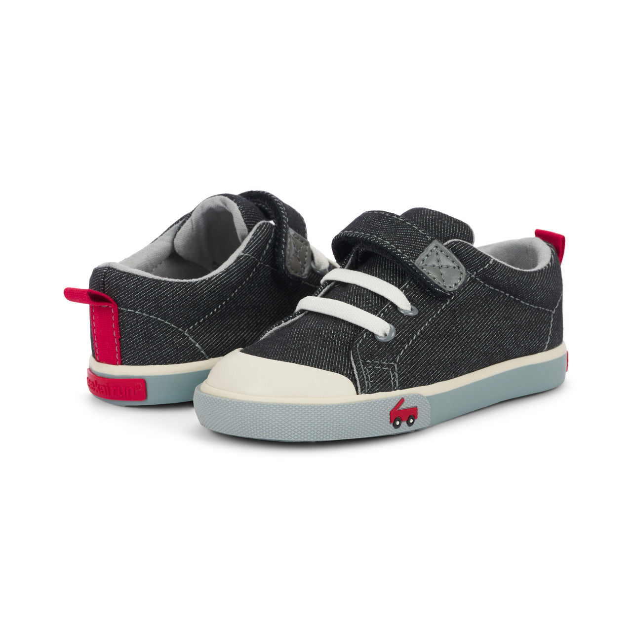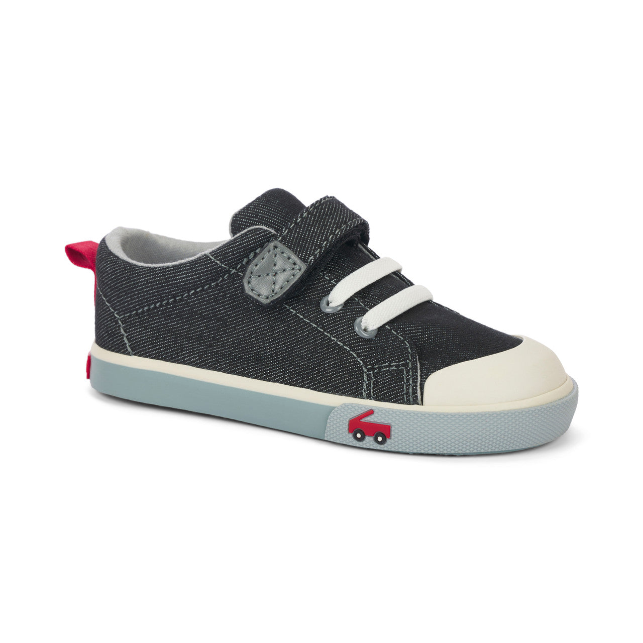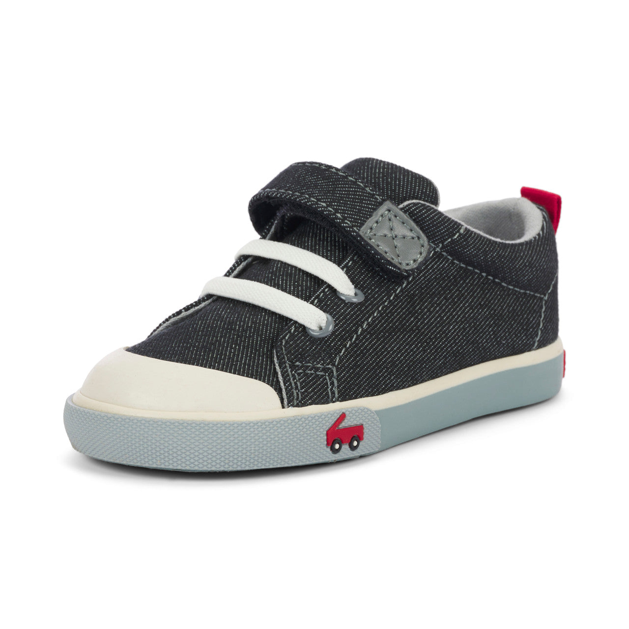 Step up their sneaker game with our classic black denim sneaker with gray accents! Featuring a leather lined removable molded footbed for happy feet, a natural rubber toe cap for superhero-level protection, and lightweight, flexible construction for all-day play.