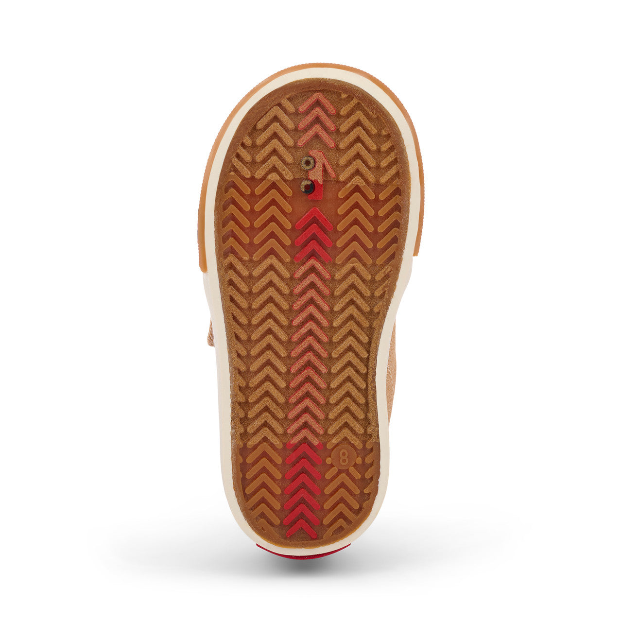 Natural rubber outsole with herringbone lug pattern provides great traction for play.