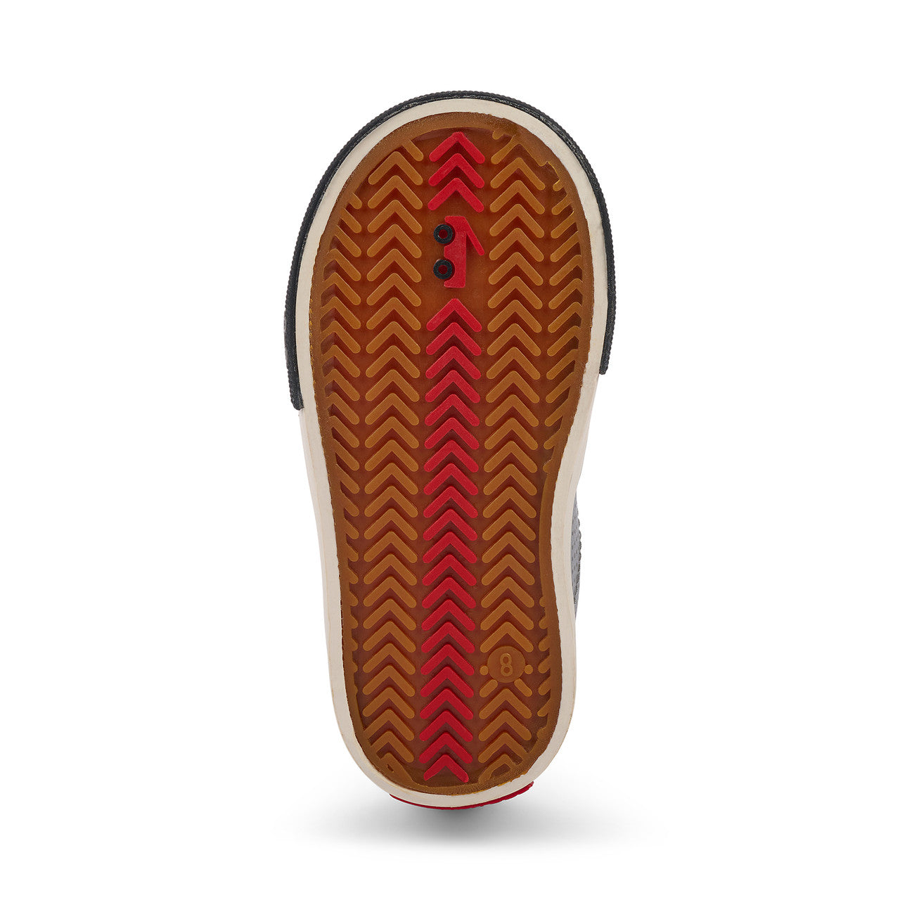 Natural rubber outsole with herringbone lug pattern provides great traction for play.