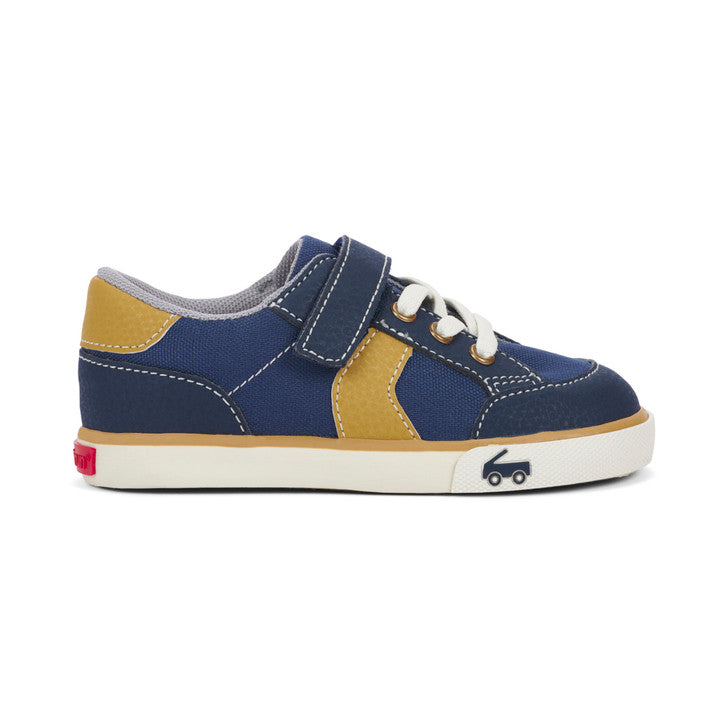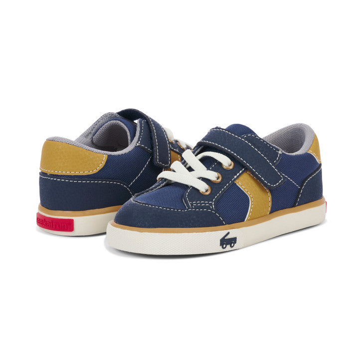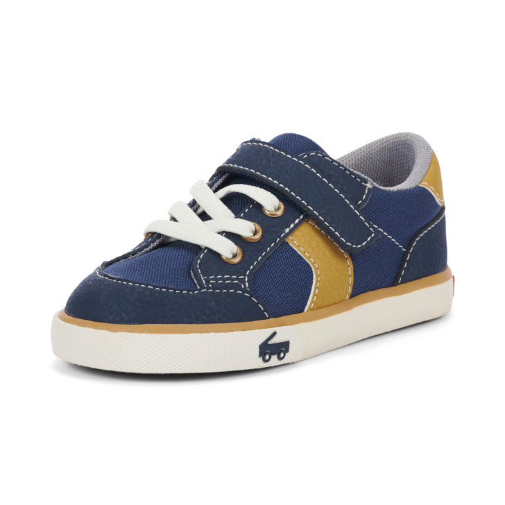 Ready, set, play with The Conner - a retro court inspired sneaker made with recycled nylon, durable navyoverlays, and tan accents. With a crisscross faux elastic lace pattern for a cool new look and ease of entry, the lightweight, flexible construction with a wide opening makes it easy to get shoes on and stay on, leaving more time for play.