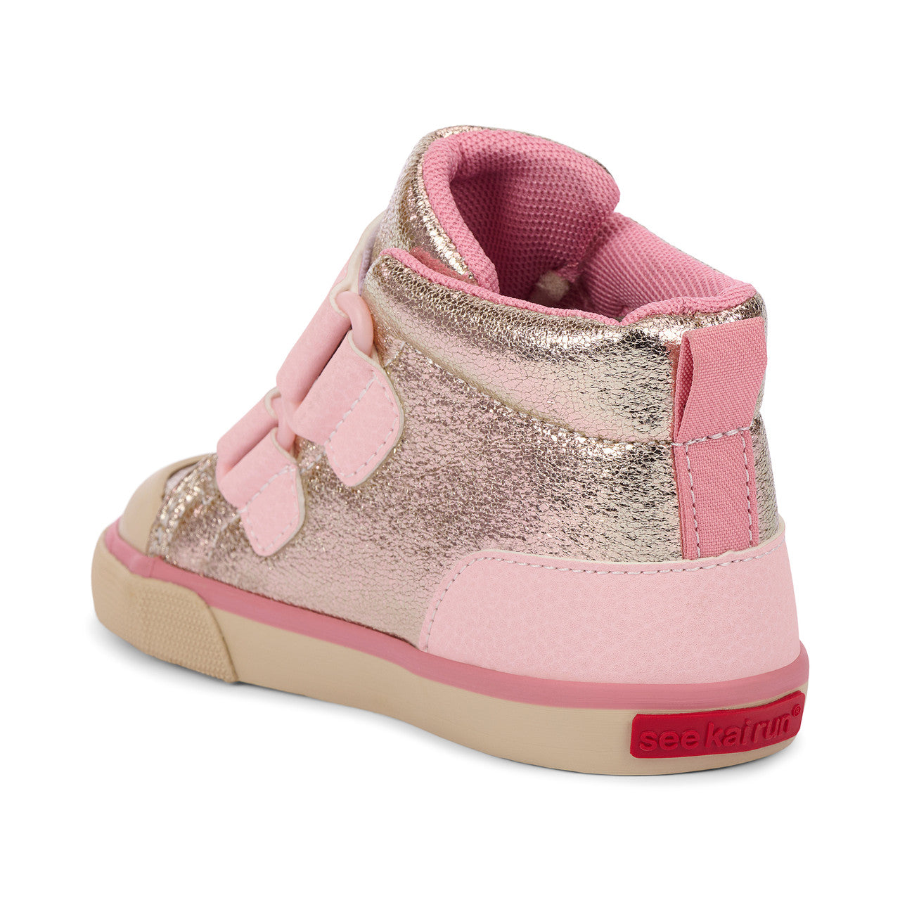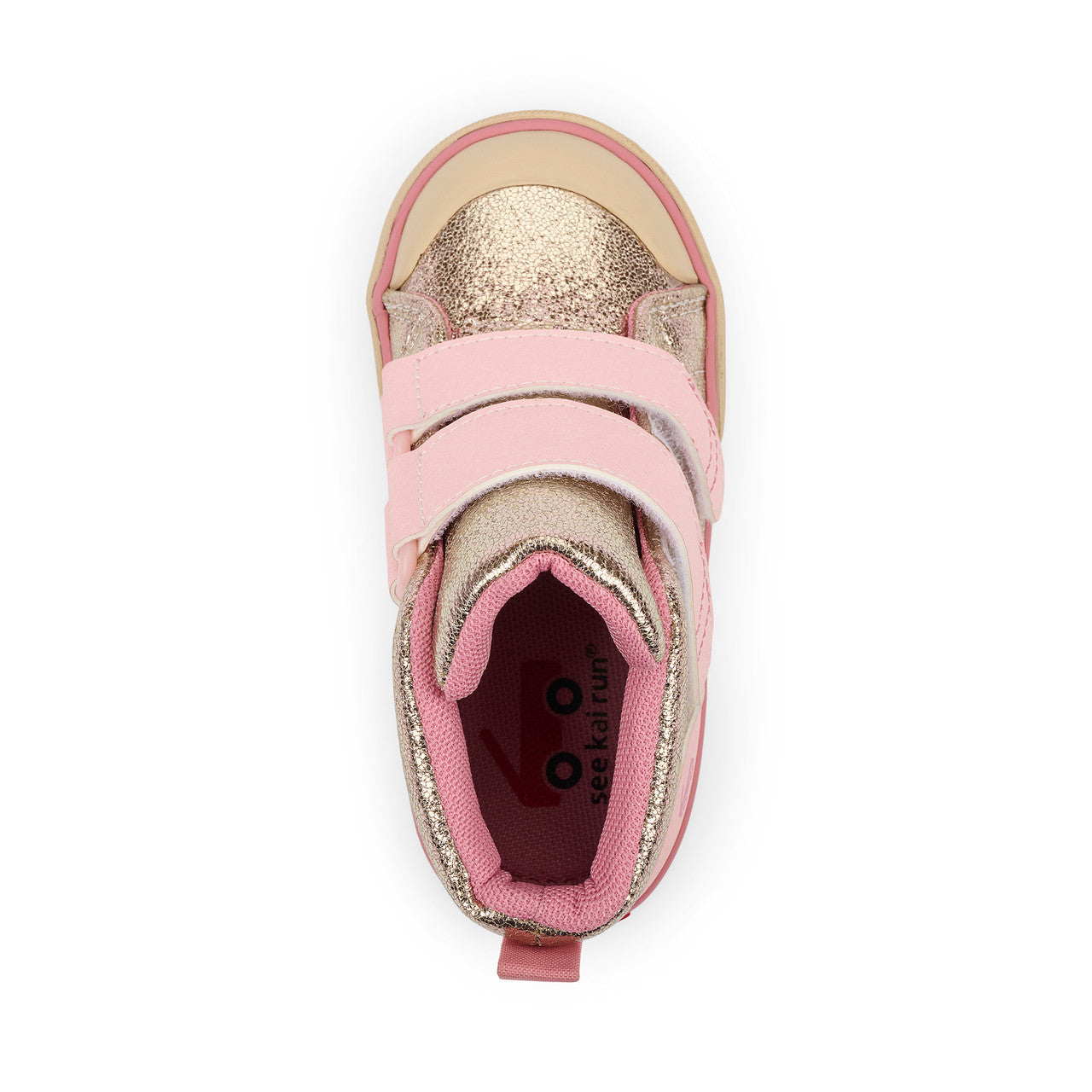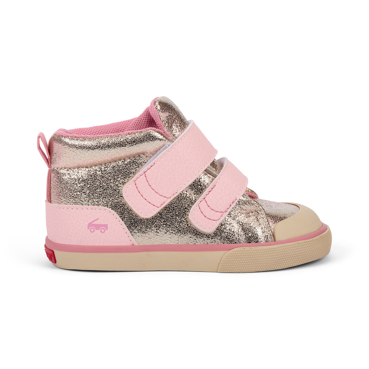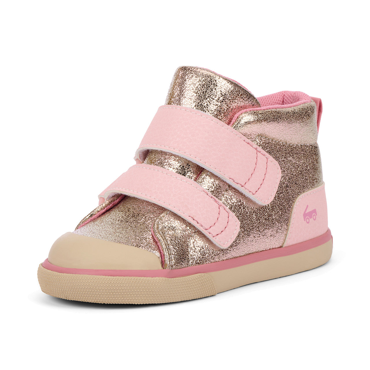 Specially designed to accommodate orthotics such as AFOs, SMOs and custom insoles, The Dean Adapt in rose gold high top sneaker is customizable for any child.  Extra-long straps fit around orthotics but can also be cut to fit. A removable insole provides extra space if needed. The sneaker opens super wide and stays open thanks to the oval ring hinge design. 42% of this shoe is made with recycled materials.