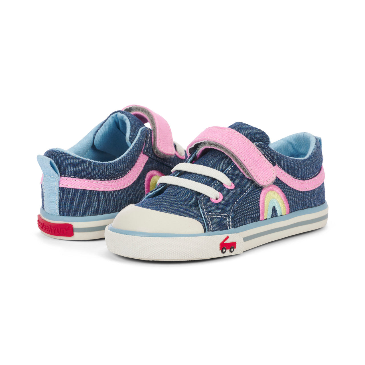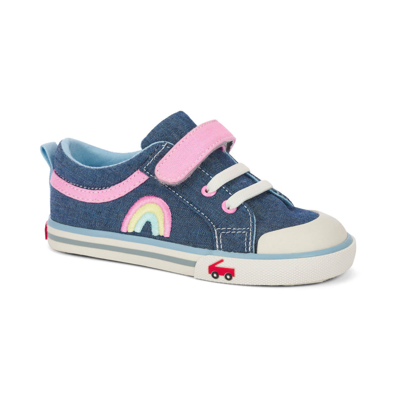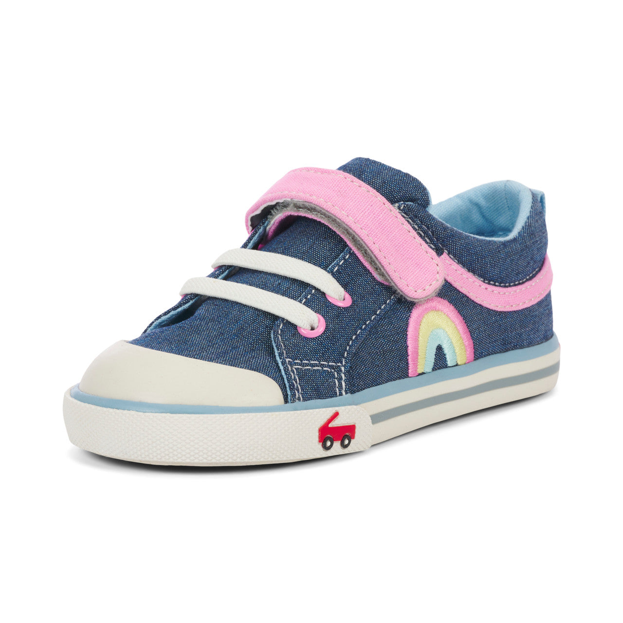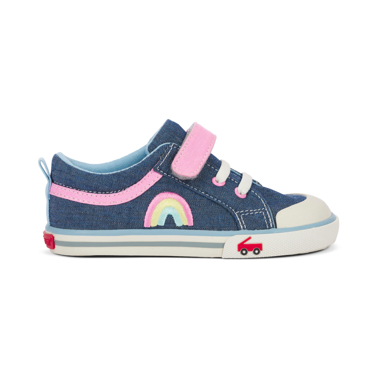 Meet Kristin Blue Chambray! A classic sneaker made of chambray with pink canvas accents and an embroidered rainbow detail. Includes a leather lined removable molded footbed for healthy foot climate. Natural rubber toe cap for added protection.