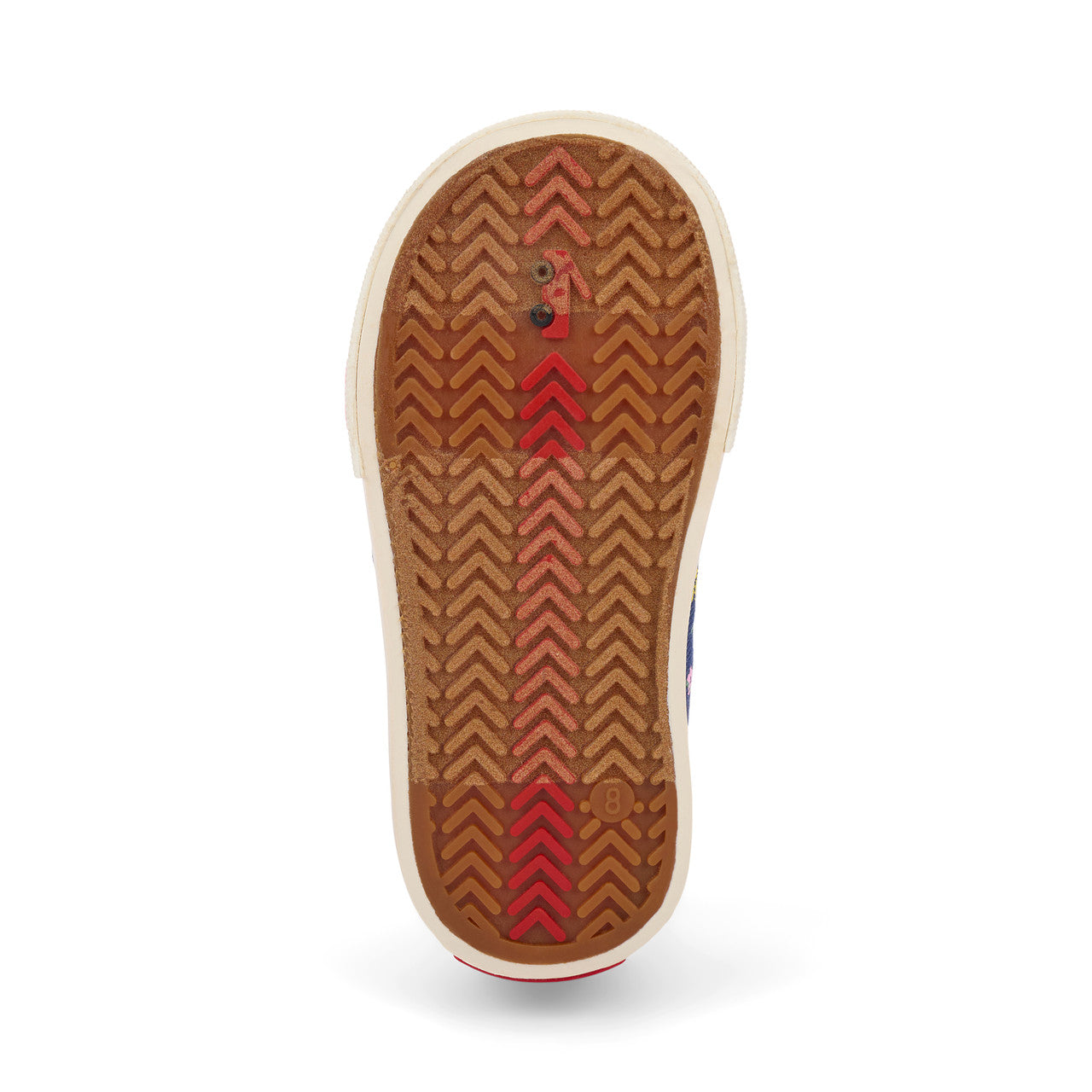 Natural rubber outsole with herringbone lug pattern provides great traction for play.