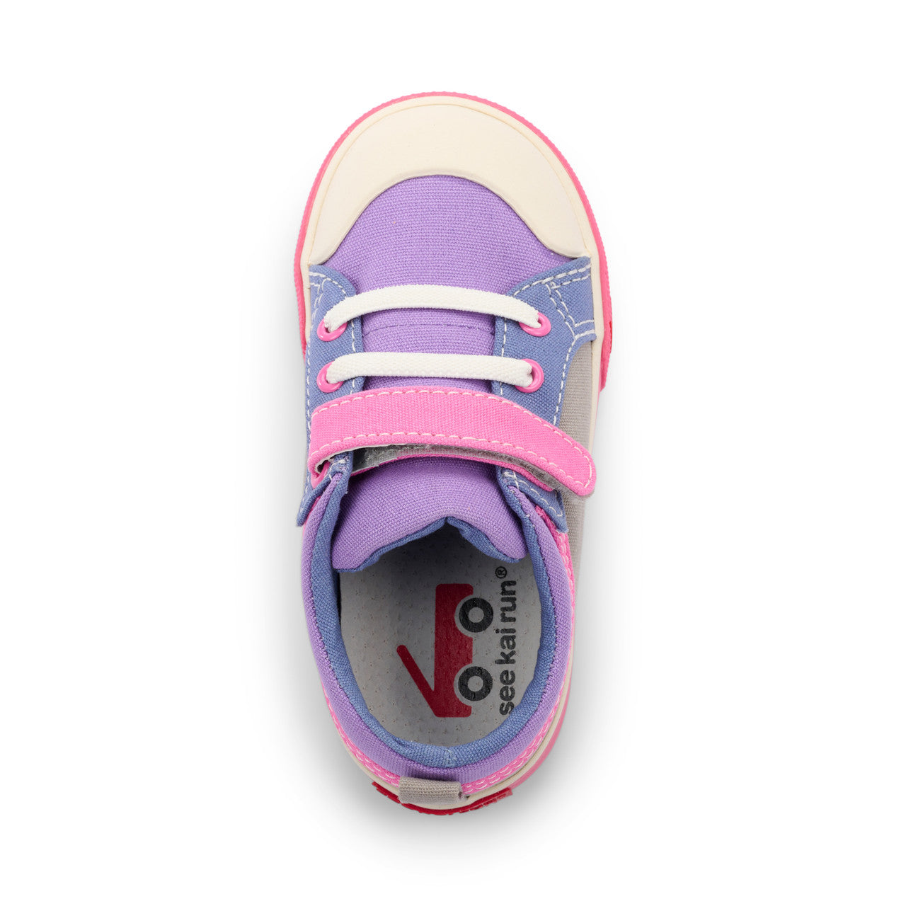 Check out this classic, fan-favorite sneaker for girls.  The canvas upper features cheerful color blocks of blue, purple, and pink for enhanced style. The natural rubber toe cap protects toes during active play.
