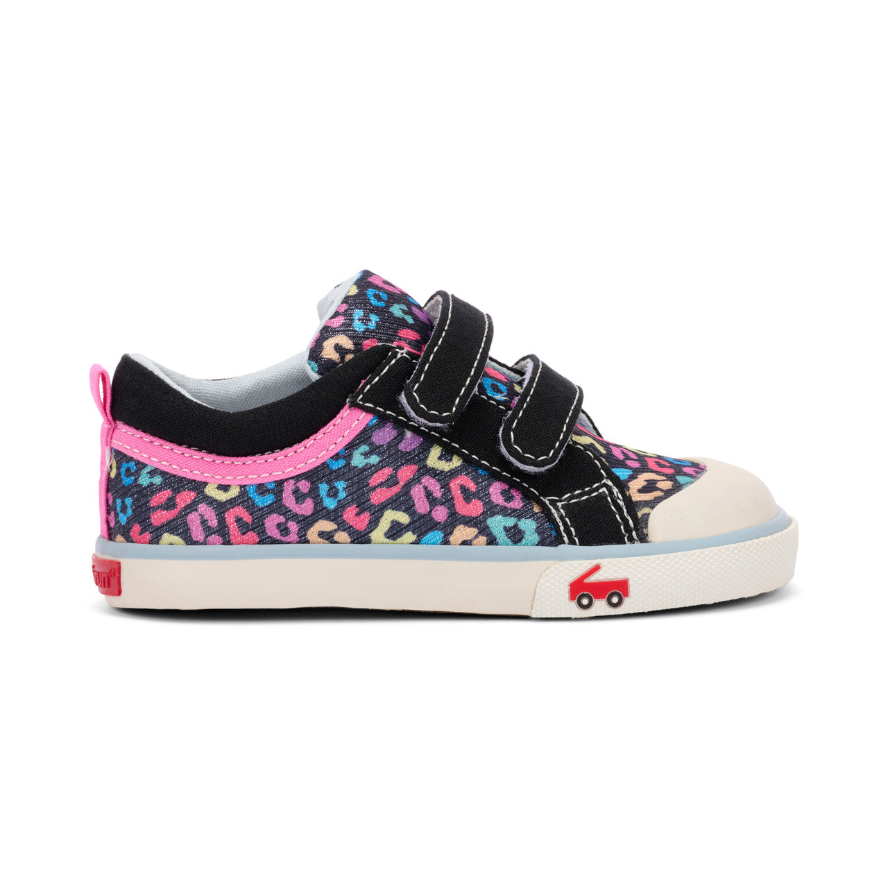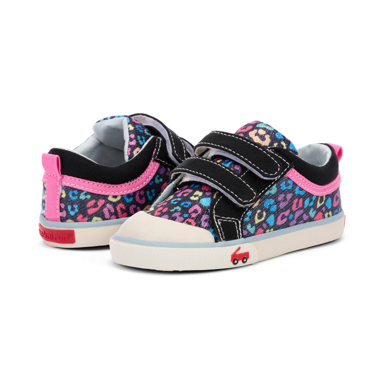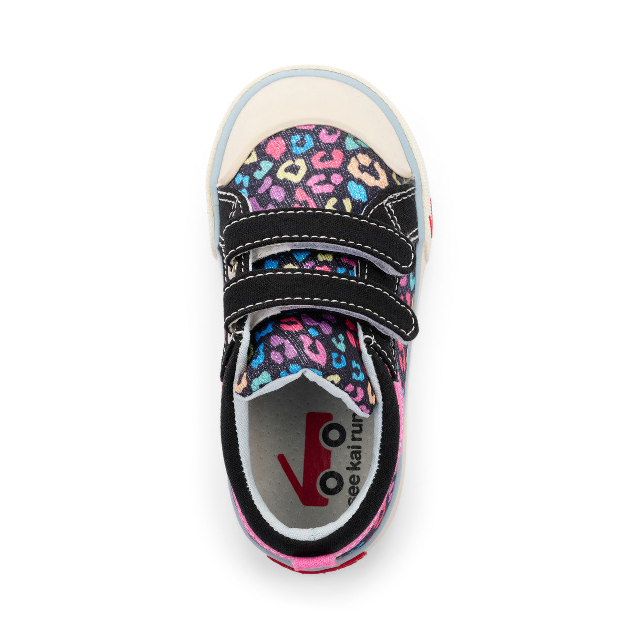 Fun and functional meets fashion, with the Robyne Black Leopard Sneaker for girls, available only at seekairun.com.  Made with colorful canvas and rainbow leopard textile, this dual strap sneaker will stand out on any occasion.