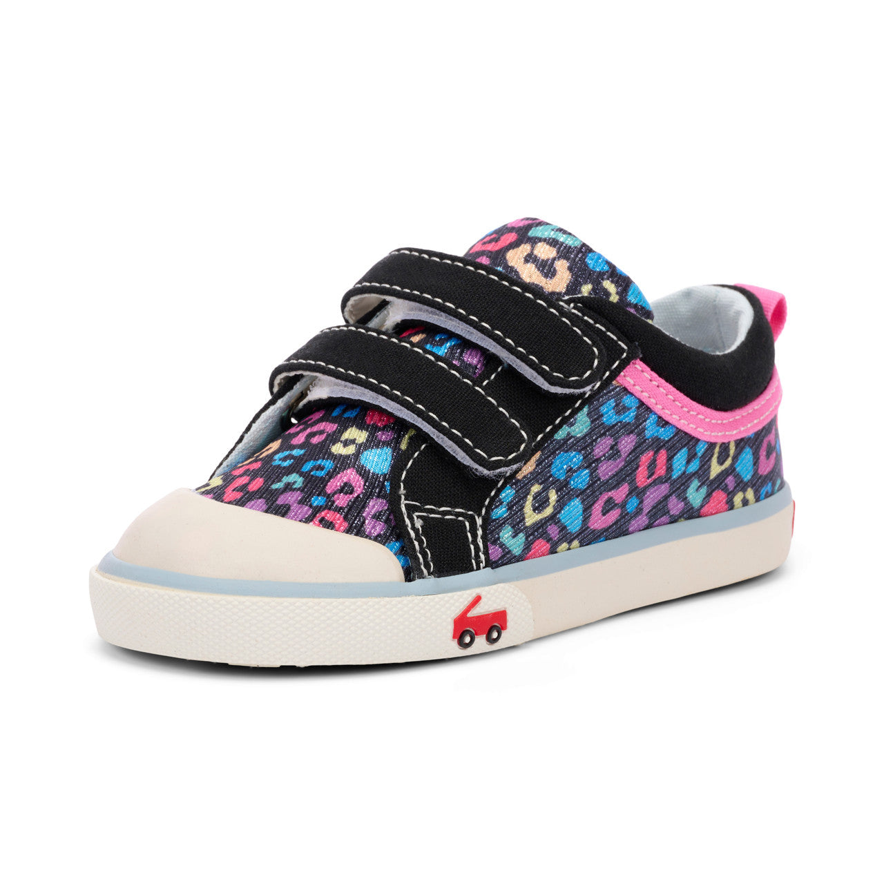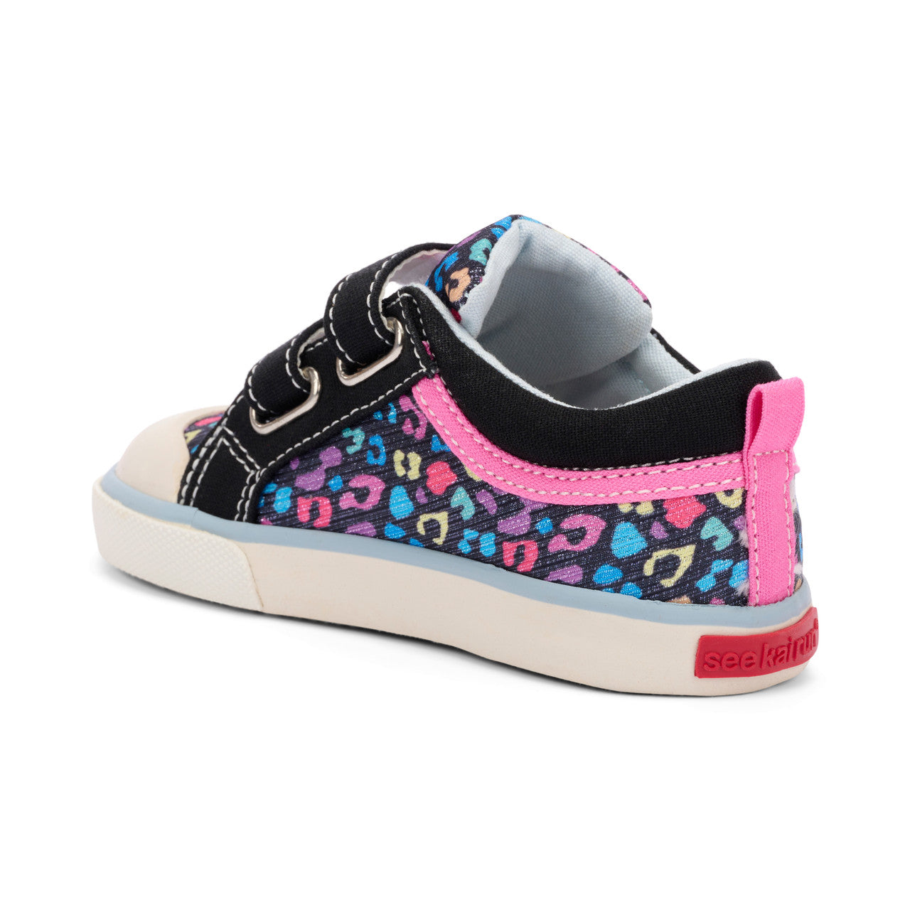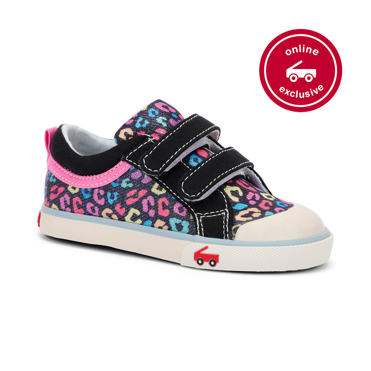 Fun and functional meets fashion, with the Robyne Black Leopard Sneaker for girls, available only at seekairun.com.  Made with colorful canvas and rainbow leopard textile, this dual strap sneaker will stand out on any occasion.