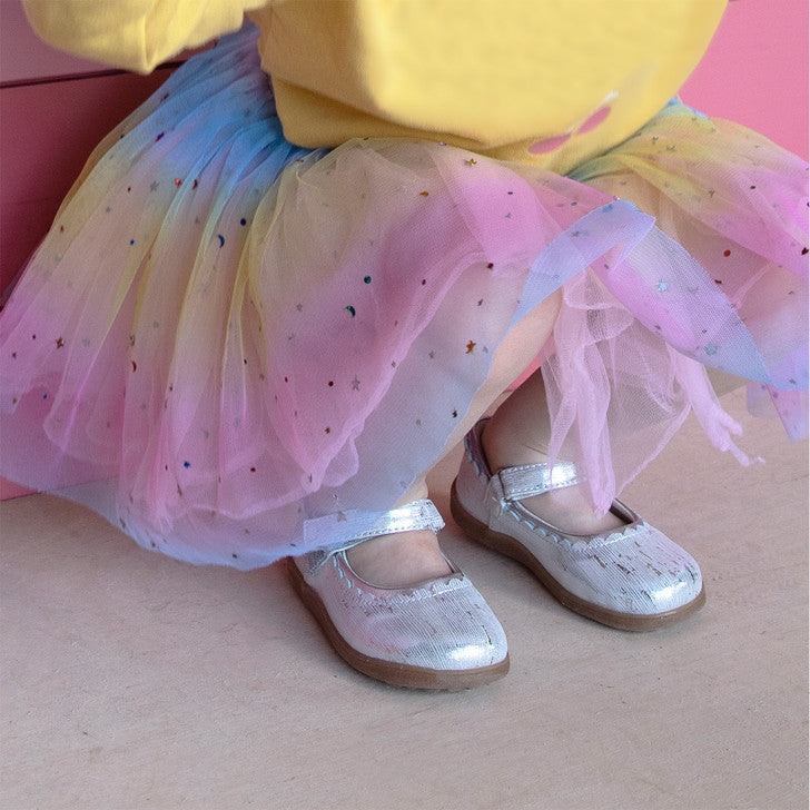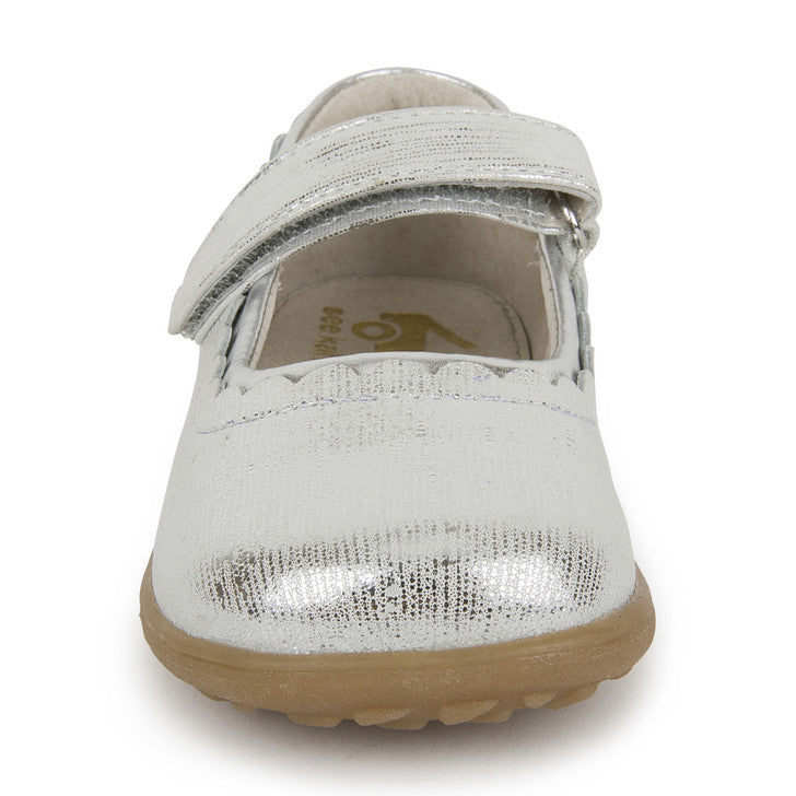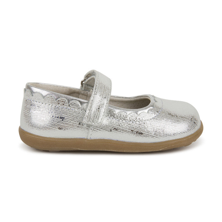 Elegant scalloped edging and a cushioned leather insole make this girls dressy shoe both stylish and comfortable.