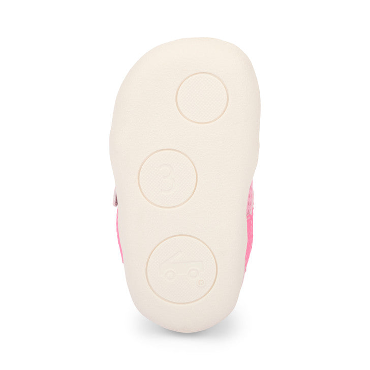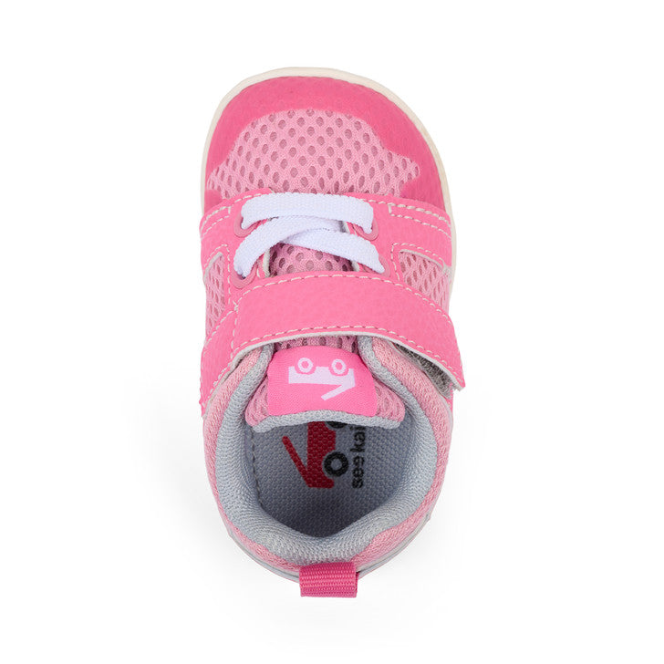 Pink mesh textile upper with nubuck-feel overlays and welded TPU toe cap to protect little toes.