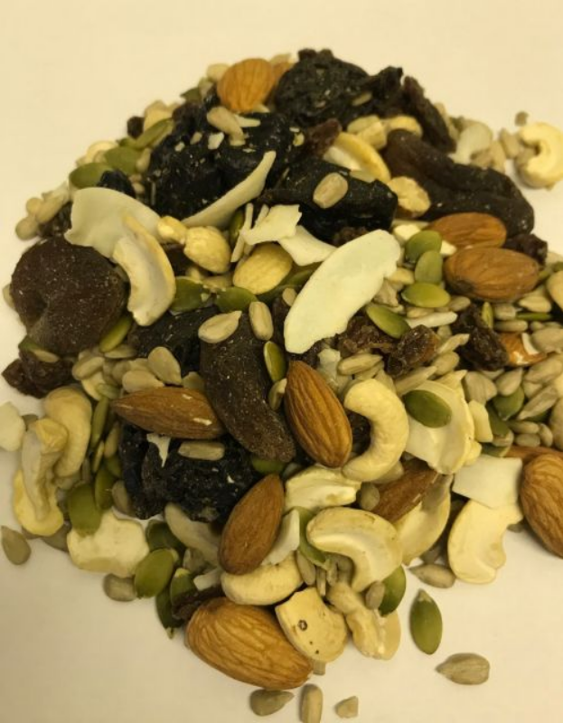 This is a great snack for on the go or when your in need up a quick bite. Our organic trail mix is a delicious blend of organic almonds, cashew pieces, raisins, sunflower kernels, pumpkin seeds, apricots, pitted prunes and coconut.